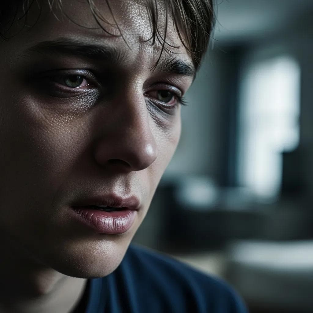 Close-up of a distressed individual showing signs of anxiety and withdrawal, illustrating the impact of MDMA addiction